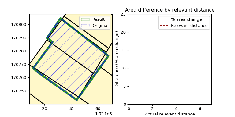 The animated gif below shows the main principle of ‘brdr’: * The visualizatuion on the left: * the original thematic geometry (blue), * A reference layer (yellow-black). * The resulting geometry after alignment with brdr (green)** * The graphic on the right: * X-as: Relevant distance (~distance that change is allowed), that increases * Y-as: Change (%) of the resulting geometry